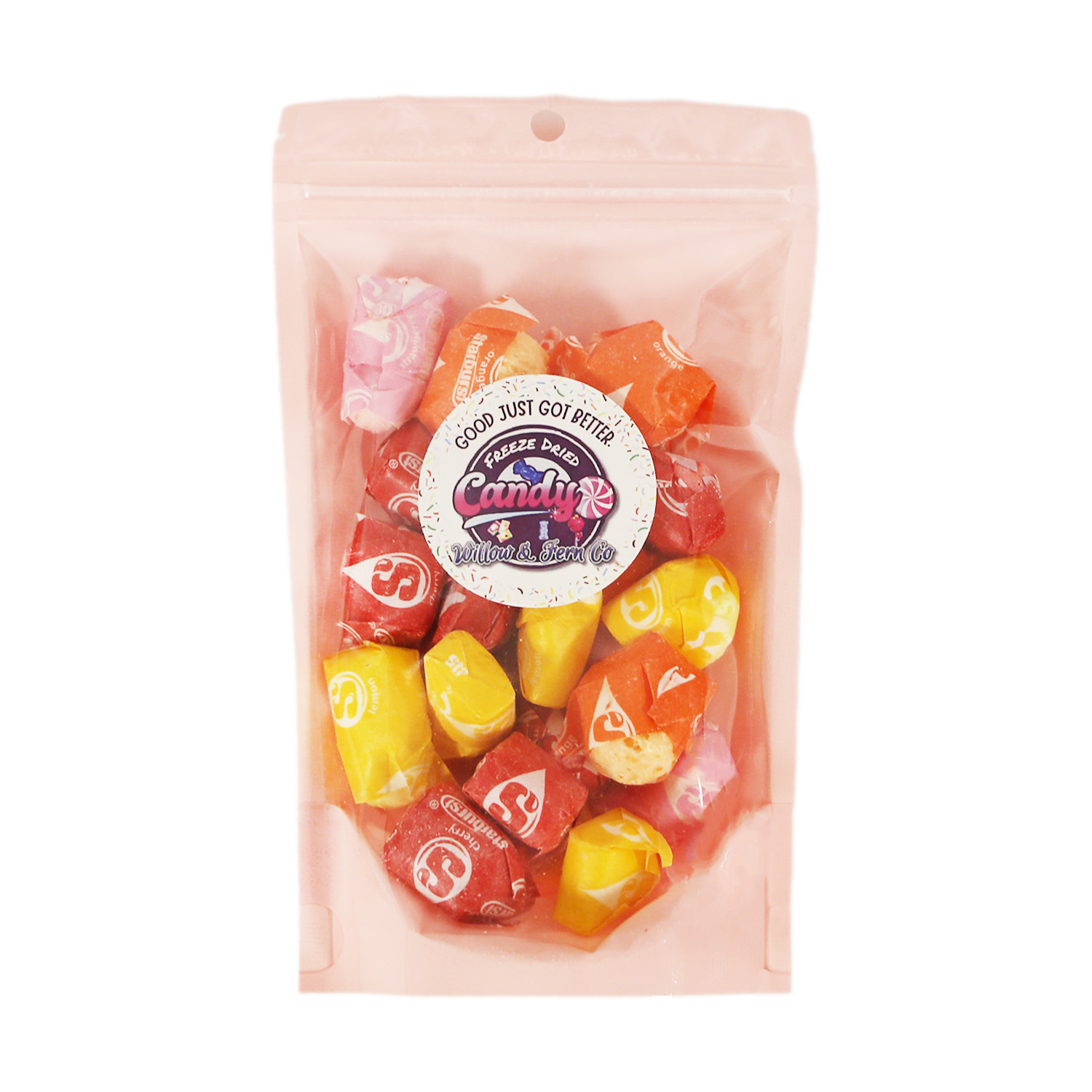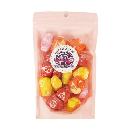 Freeze-dried fruit-flavored candy bites with a crisp crunch and bright citrus notes.