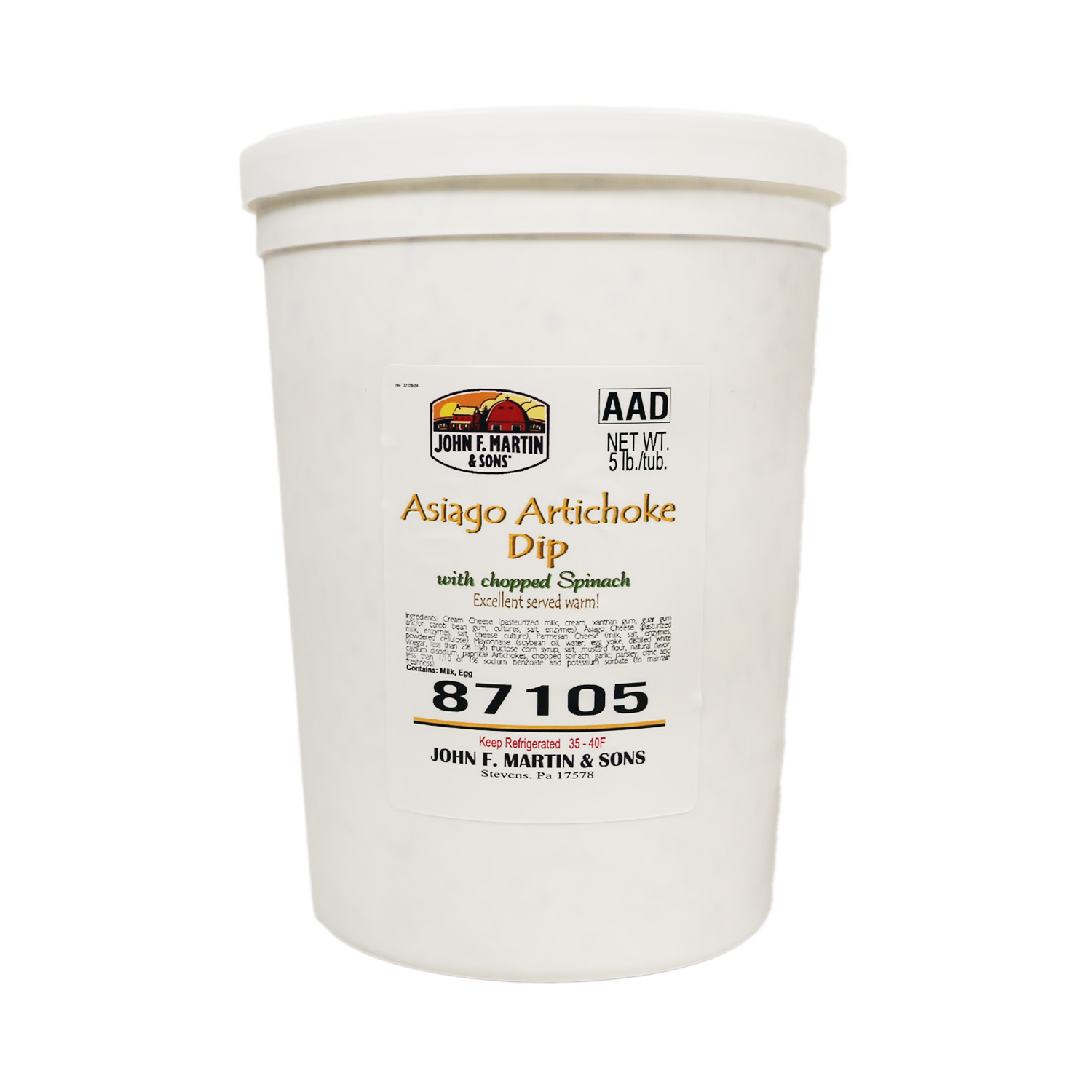 Cream Cheese (pasteurized milk, cream, xanthan gum, guar gum and/or carob bean gum, enzymes, salt), Asiago Cheese (cultured milk, enzymes, salt, cellulose, natamycin), Parmesan Cheese (milk, cultures, salt, potassium sorbate), Mayonnaise (water, soybean oil, vinegar, egg yolks, salt), Artichokes, Chopped Spinach, Garlic, less than 1/10 of 1% Sodium Benzoate and Potassium Sorbate, Citric Acid (to maintain freshness).