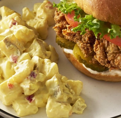 Potatoes, Soybean Oil, Water, Eggs, Mustard (distilled vinegar, mustard seed, salt, turmeric, spices), Onions, contains less than 2% of High Fructose Corn Syrup, Celery, White Distilled Vinegar, Red Bell Peppers, Salted Egg Yolks, Salt, Sugar, Mustard (water, distilled vinegar, mustard seed, salt, spices), Potassium Sorbate (to prevent spoilage), Modified Cornstarch, Dextrose, Whey Protein Concentrate, Guar Gum, Xanthan Gum, Spices, Turmeric (color) and Annatto (color), Onion Powder, Paprika (color).