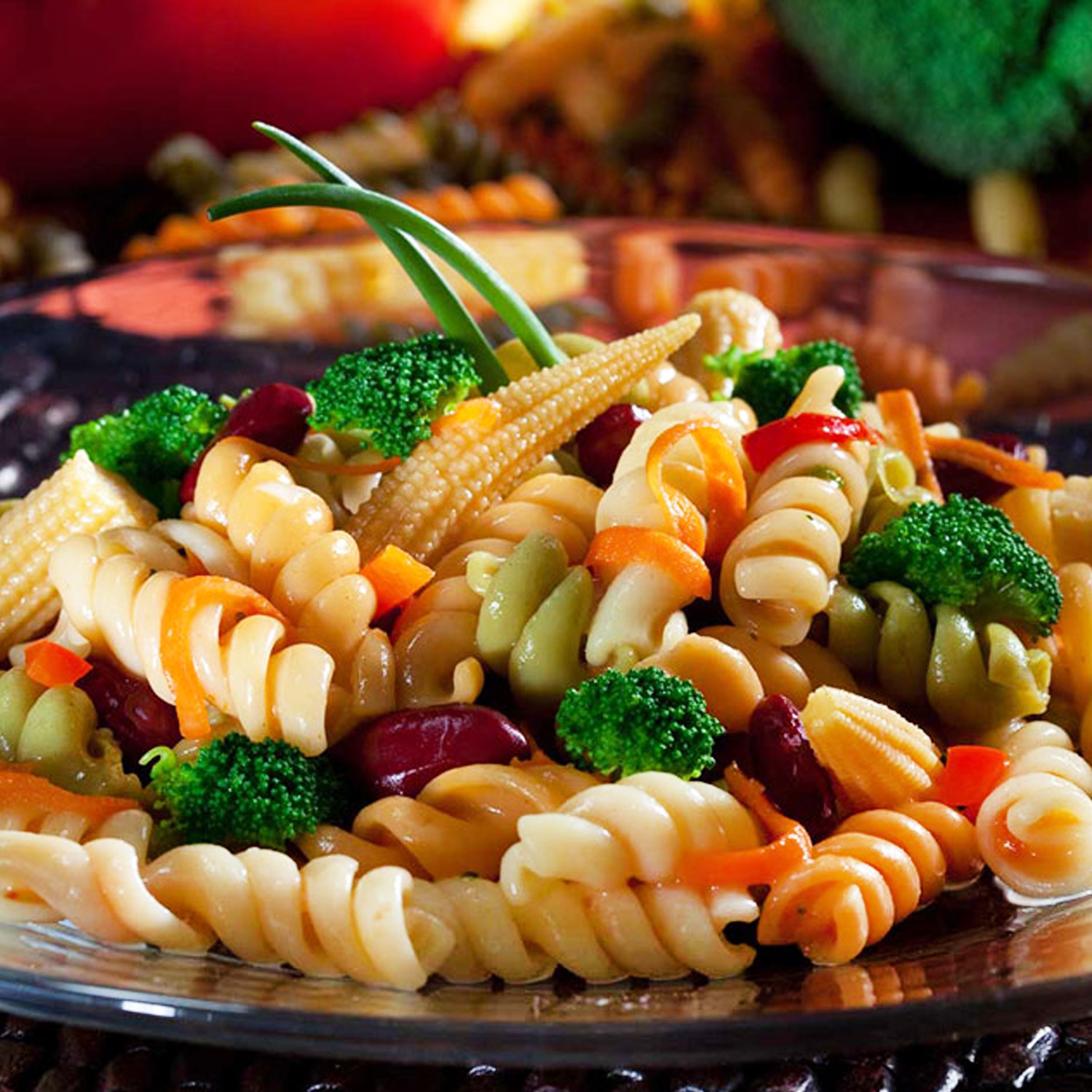 Tri-Color Rotini (water, pasta [semolina (wheat), dried spinach, dried tomato, niacin, iron (ferrous sulfate), thiamin mononitrate, riboflavin, folic acid]), Italian Dressing (soybean oil, water, distilled vinegar, high fructose corn syrup, salt, contains 2% or less of: dried onion, dried garlic, xanthan gum, dried red bell pepper, spices, yellow 5, yellow 6, propylene glycol alginate, lemon juice concentrate, calcium disodium EDTA [to protect flavor], paprika [color]), Sugar, Kidney Beans (red kidney beans, water salt, calcium chloride, disodium EDTA [to preserve color]), Ketchup (tomato concentrate [water, tomato paste], corn syrup, vinegar, salt onion, natural flavorings, garlic), Onion Green Peppers, Carrots, Baby Corn (baby corn, water, salt, citric acid), Broccoli, Red Pepper (peppers, water, salt, citric acid), Water, less than 1/10 of 1% Sodium Benzoate (preservative).