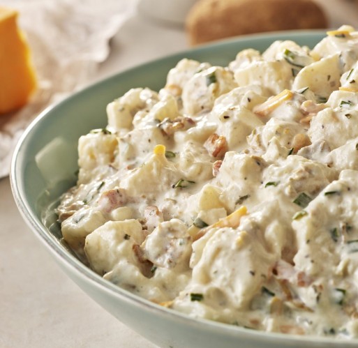Potatoes, Soybean Oil, Water, Sour Cream (cultured milk and cream), contains less than 2% of Cheddar Cheese (milk, culture, salt, enzymes, annatto [color], anti-caking blend [potato starch, powdered cellulose]), Eggs, Chives, Sugar, Salt, Salted Egg Yolks, Granulated Onion, Fully Cooked Bacon Bits With Smoke Flavor Added (bacon bits [cured with water, salt, sugar, sodium phosphates, sodium erythorbate, sodium nitrite], smoke flavor [may contain dextrose, potassium chloride]), White Distilled Vinegar, Spices, Potassium Sorbate (to prevent spoilage), Lemon Juice Concentrate, Granulated Garlic, Paprika (color).