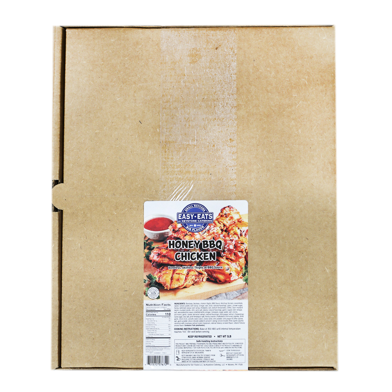 Boneless Skinless Chicken Thighs, BBQ Sauce: Ketchup (tomato concentrate [water, tomato paste], corn syrup, vinegar, salt, onion, natural flavorings, garlic), Brown Sugar, Honey, Dark Karo Syrup (corn syrup, molasses, salt, sodium benzoate), Coffee, Dijon Mustard (water, mustard seeds, citric acid, salt, onions, natural flavorings, garlic), Apple Cider Vinegar, Salt, Worcestershire Sauce (distilled white vinegar, molasses, sugar, water, salt, onions, anchovies, garlic, cloves, tamarind extract, natural flavorings, chili pepper extract), Seasonings: Cane Sugar, Sea Salt, Pink Himalayan Salt, Honey Powder (maltodextrin and honey), Paprika, Dried Garlic, Dried Onion, Annatto Seed (color), Celery Seed, Chili Powder (chili pepper and other spices, salt, garlic powder silicon dioxide added to prevent caking), Silicon Dioxide (flow agent), Paprika Oleoresin with Rosemary Extract (color), Marjoram, Natural Hickory Smoked Flavor, Natural Hickory Smoke Flavor.