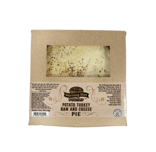 Turkey ham, potatoes, milk, cheddar cheese, butter, potato flour, hickory smoke, slat, contains less than 2% of sugar, salt, potassium lactate, sodium phosphate, sodium diacetate, sodium bicarbonate, yeast extract, hickory smoke flavor, dextrose, sodium erythorbate, sodium nitrate, cheese cultures, salt, enzymes, annatto, potato starch, powdered cellulose (to prevent caking), crust (wheat flour, vegetable shortening, milk, apple cider vinegar, baking powder, sea salt).