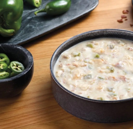 Water, Milk (milk, vitamin D3 added), Green Bell Peppers, Onions, Cooked White Meat Chicken With Rib Meat, Cream Cheese (cultured milk and cream, salt, stabilizers [guar gum, carob bean gum]), Fully Cooked Bacon Bits with Smoke Flavor Added (bacon bits [cured with water, salt, sugar, sodium phosphates, sodium erythorbate, sodium nitrite], smoke flavor [may contain dextrose, potassium chloride]), Cheddar Cheese (milk, culture, salt, enzymes, annatto [color], anti-caking blend [potato starch, powdered cellulose]), Modified Cornstarch, contains less than 2% of Jalapeño Peppers, Garlic, Chicken Base (roasted chicken, salt, yeast extract, natural flavor, turmeric), Salt, Rendered Bacon Fat (cured with water, salt, sugar, sodium erythorbate, sodium nitrite, smoke flavoring, dextrose, brown sugar, sodium phosphate, potassium chloride, sodium diacetate, flavoring, honey, [TBHQ and citric acid added as stabilizers]), Sodium Citrate, Spices, Nisin Preparation (salt, nisin [preservative]) .
