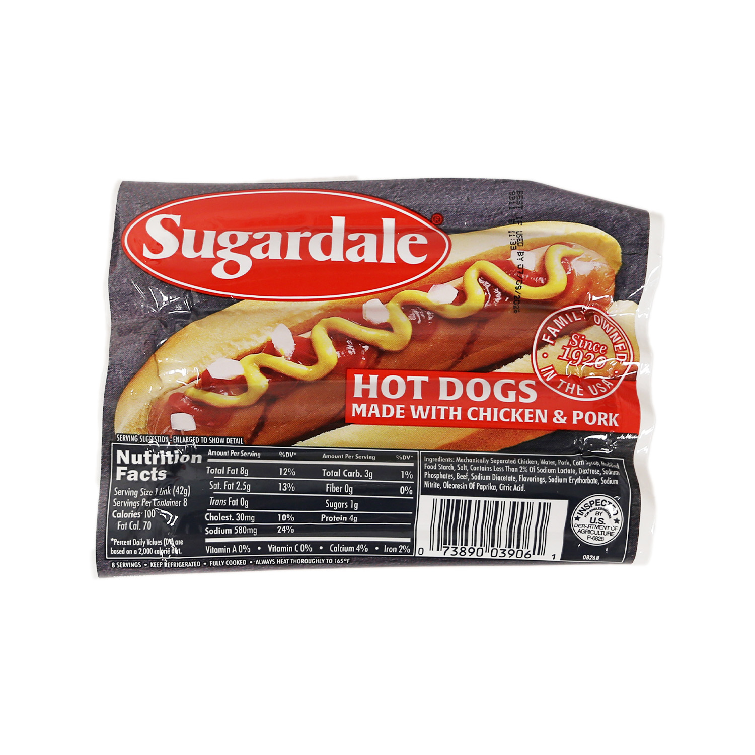 Mechanically separated chicken, water, pork, corn syrup, modified food starch, salt, contains less than 2% of sodium lactate, dextrose, sodium phosphates, beef, sodium diacetate, flavorings, sodium erythorbate, sodium nitrate, oleoresin of paprika, citric acid.